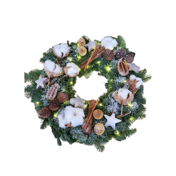 Handgebonden kerstkrans versierd in naturelkleuren. De katoenpluisen en sneeuw geven het een gezellige sfeer.
