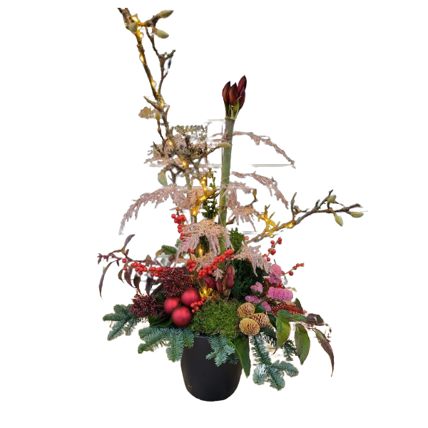 Mooi kerststuk met verse bloemen in traditionele kleuren. Dit bloemstuk heeft een stevige schaal als ondergrond en voor het feestgevoel heeft het bloemstuk ook kerstverlichting.