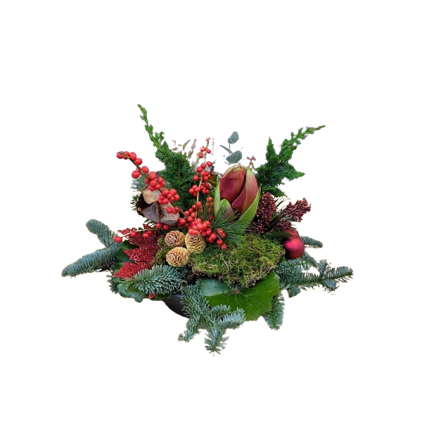 Kerststuk in het rood met verse bloemen. Verschillende soorten groen met natuurlijke materialen en een kleine glitter om het kerstgevoel helemaal compleet te maken.